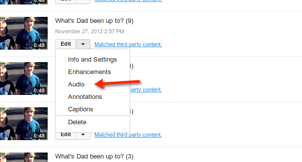 Find the video you lot want to remove a song from. Then, click on the pointer next to Edit and cull Audio.
